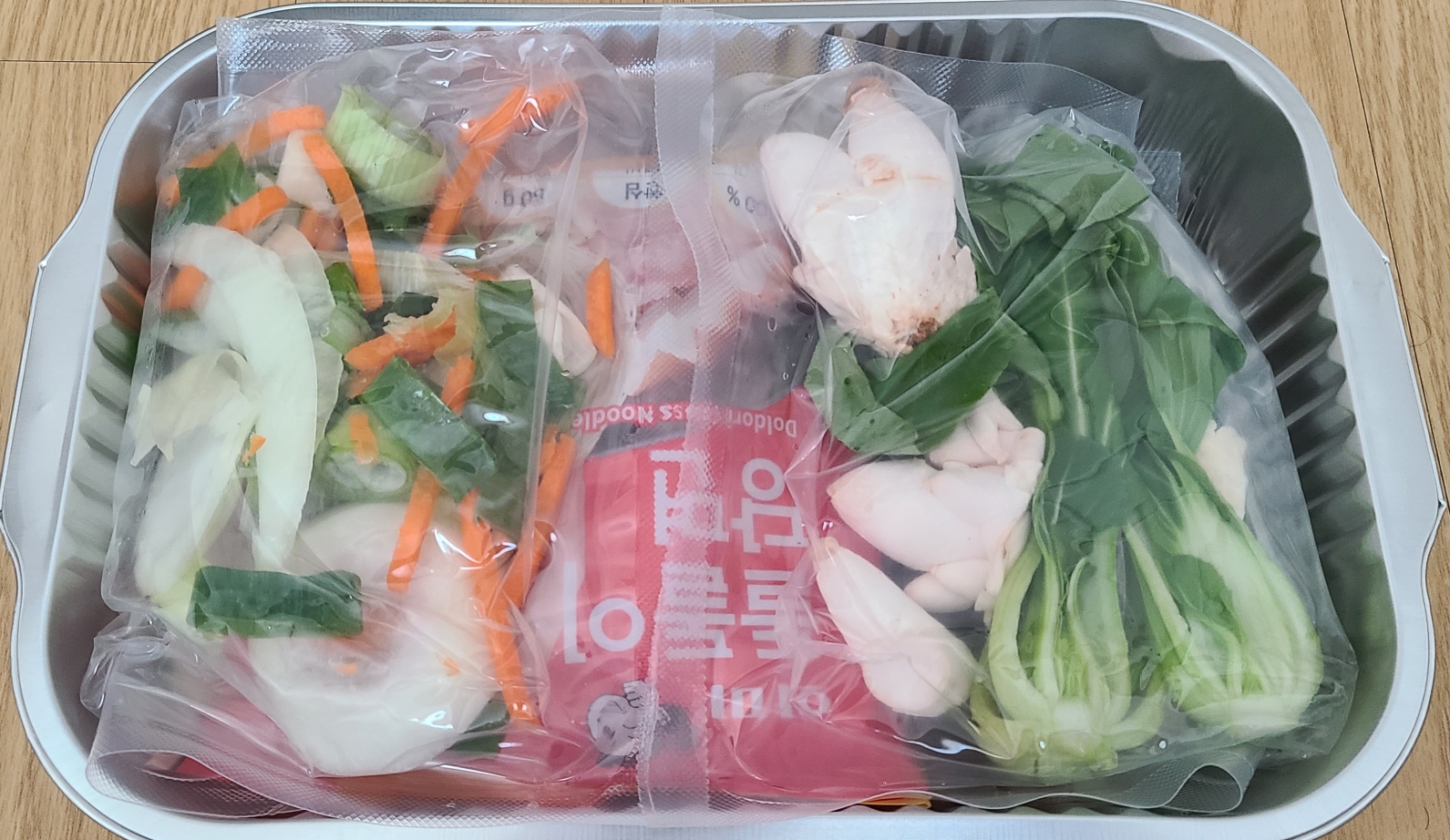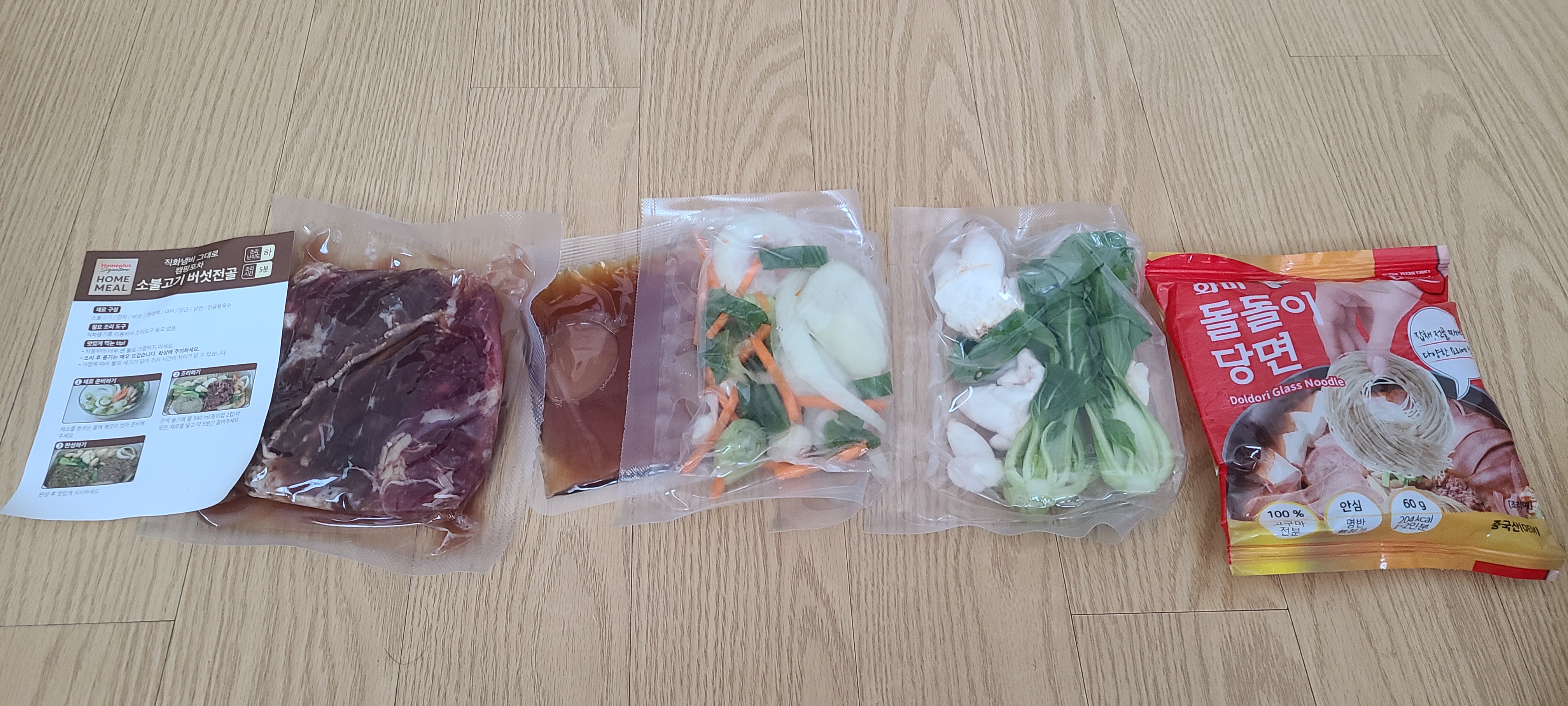 레시피, 양념된 소고기, 육수용 소스, 채소팩1(양파, 당근채, 대파), 채소팩2(꼬마새송이버섯, 청경채), 당면이 들었음.