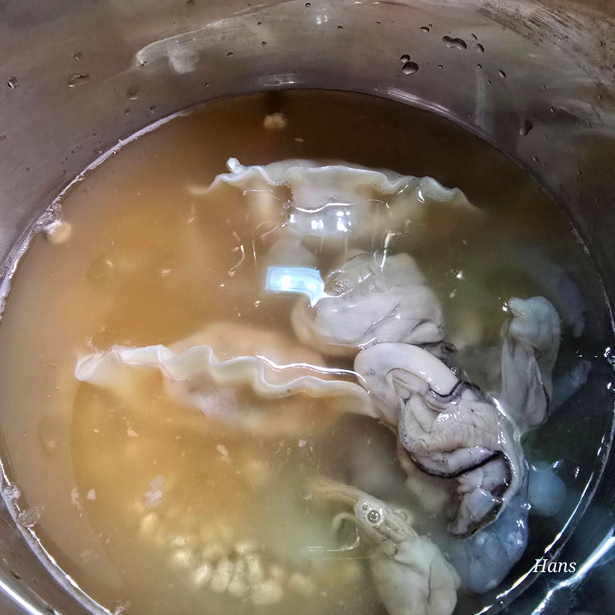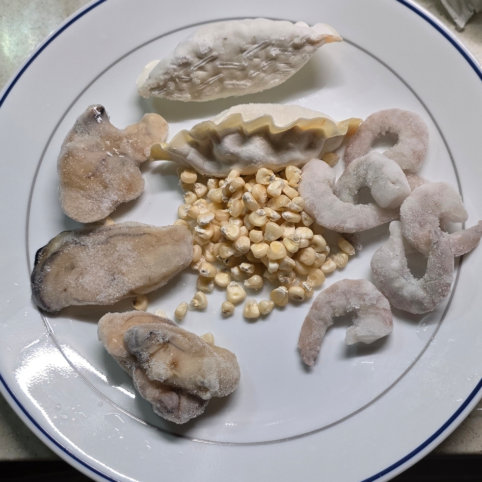 저는 냉동굴, 냉동새우, 비비고 김치만두, 옥수수 알갱이와 계란을 준비. 지난 번 굴 비린내 때문에 물에 더 많이 씻었어요.(사진은 씻기 전)