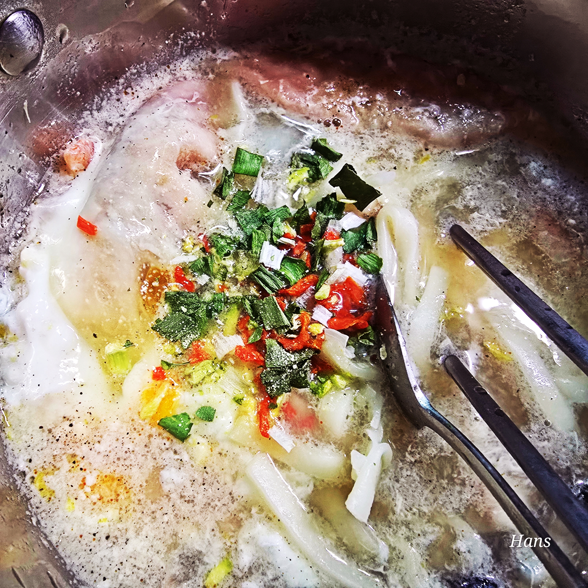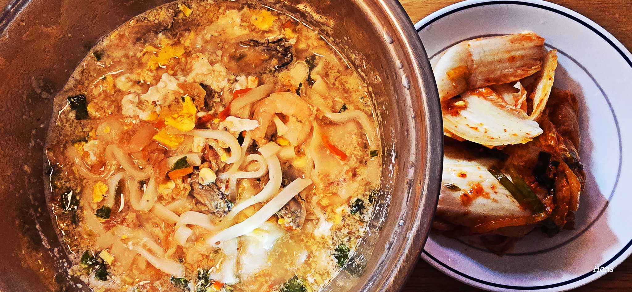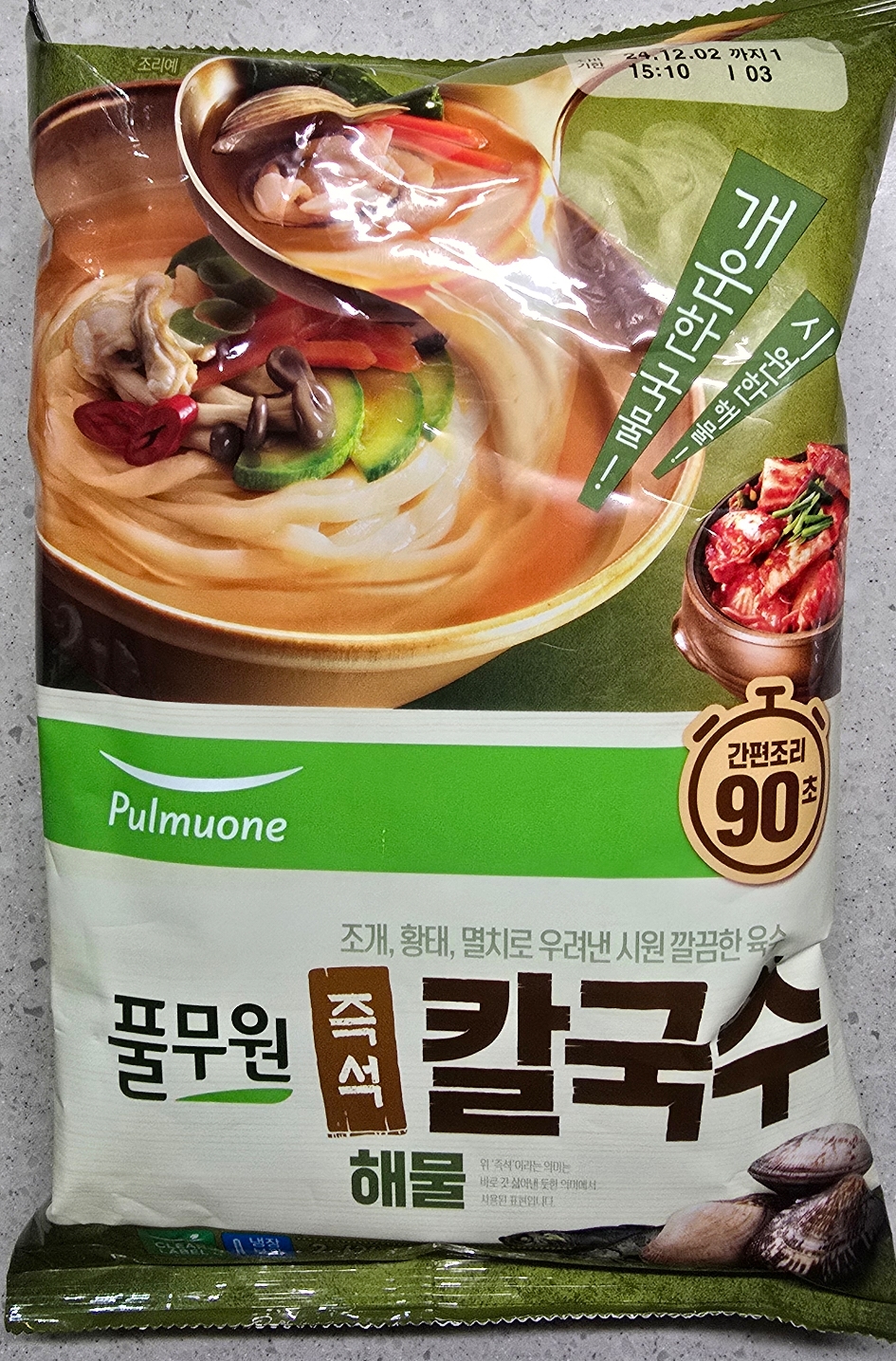 물이 끓자 칼국수면도 넣고 건더기 스프도 넣고 90초만 더 끓이면 되는데 냉동굴 비린내 날아가라고 조금 더 끓였답니다.