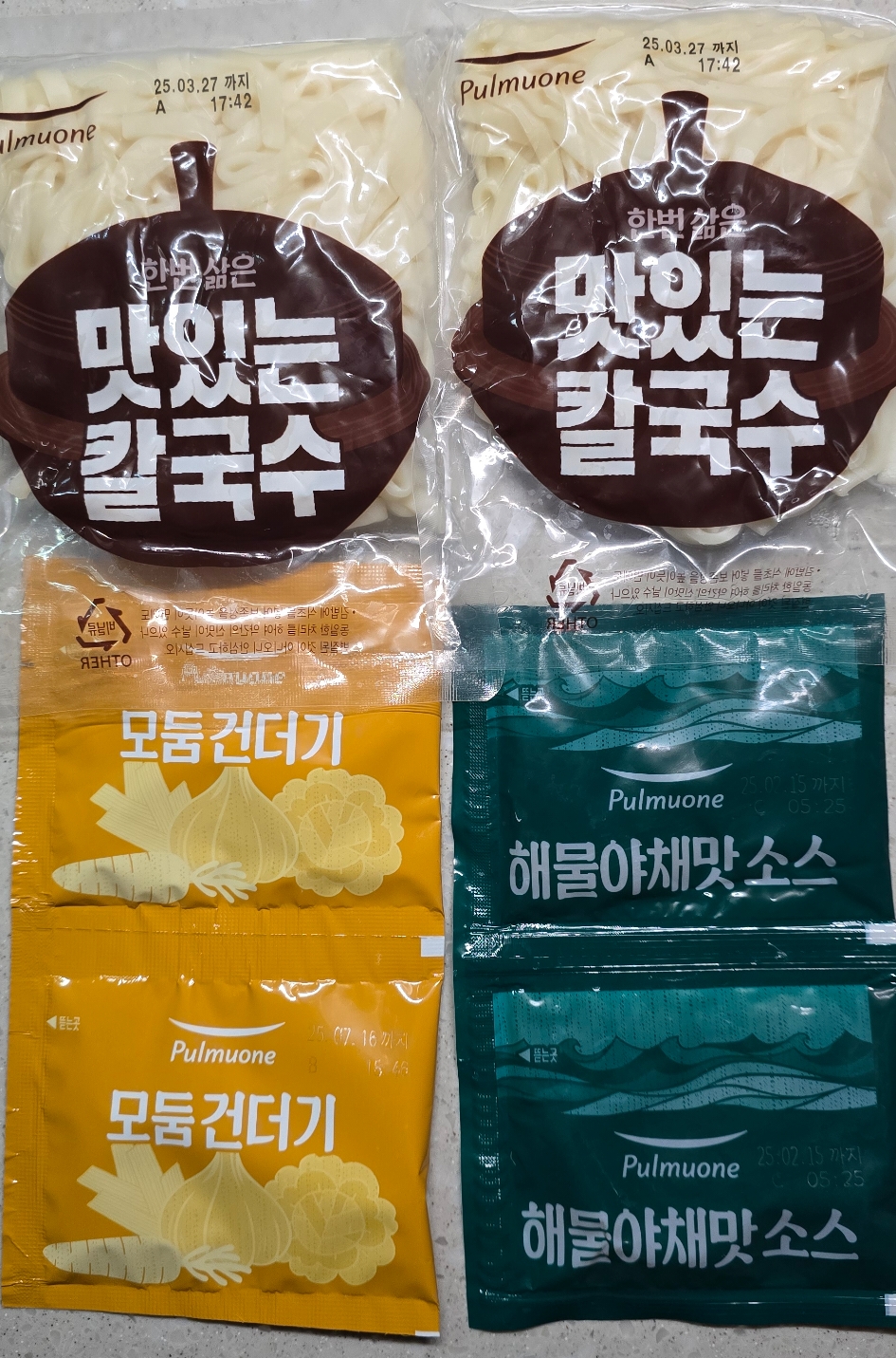 칼국수면 2개, 해물야채맛소스 2개, 건더기스프 2개.