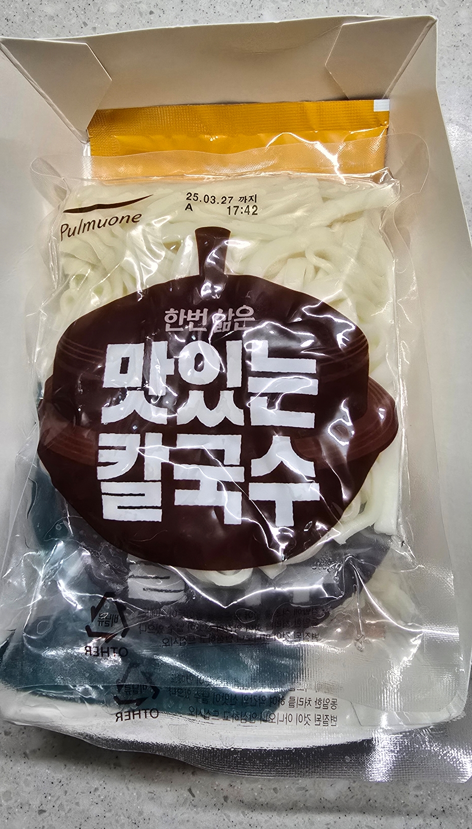 비닐 포장을 뜯으면 종이박스안에 내용물이 들어 있어요. 칼국수가 한번 익힌 제품이라 90초만 끓이시면 돼요.