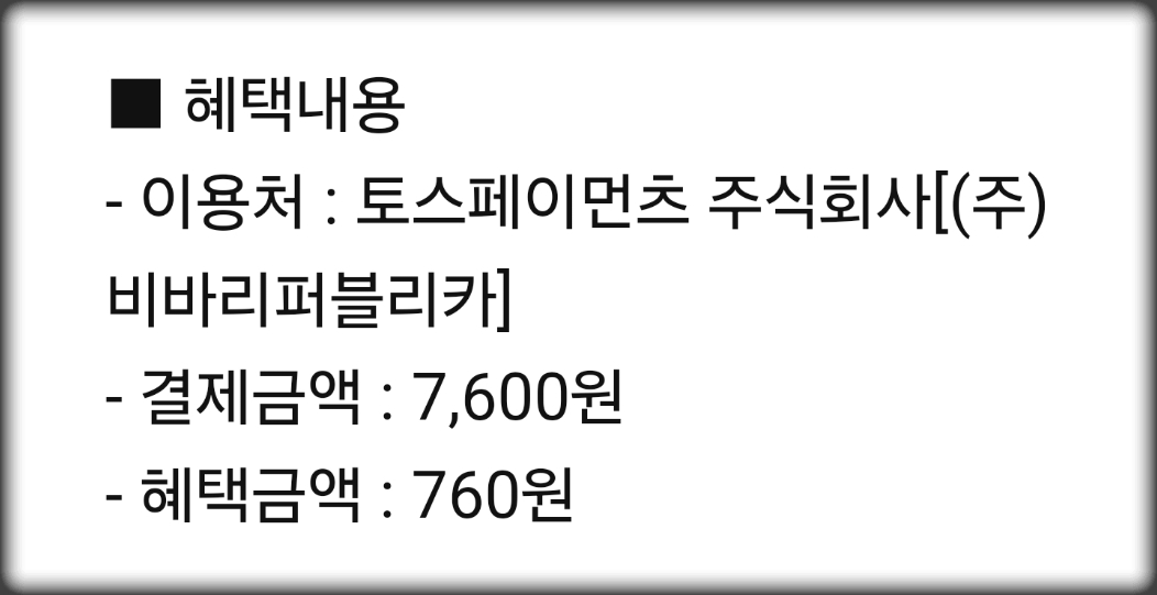 토스페이를 통해서 삼성 모니모카드로 결제하면 요기요 10% 청구할인이 됩니다. 그럼 7600원 빼기 760원은? 6840원이 되는데 여기서 끝이 아니쥬. 토스페이 구독으로 4% 토스페이포인트가 적립이 되어 304원 할인 효과.