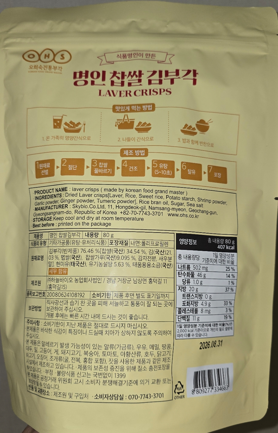 배달의 민족 비마트에서 5000원대에 구입한 김부각. 판매명은 오희숙 명인찹쌀 김부각 80g.