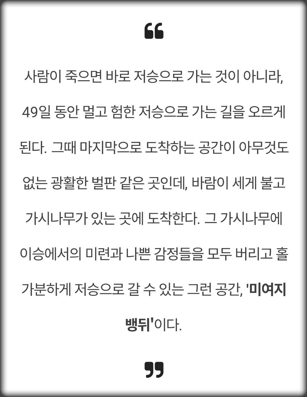 이승과 저승, 삶과 죽음의 경계 '미여지 뱅뒤'를 통해 제주의 순환과 소멸을 담아내는 시공간적 재현을 담고 있답니다.