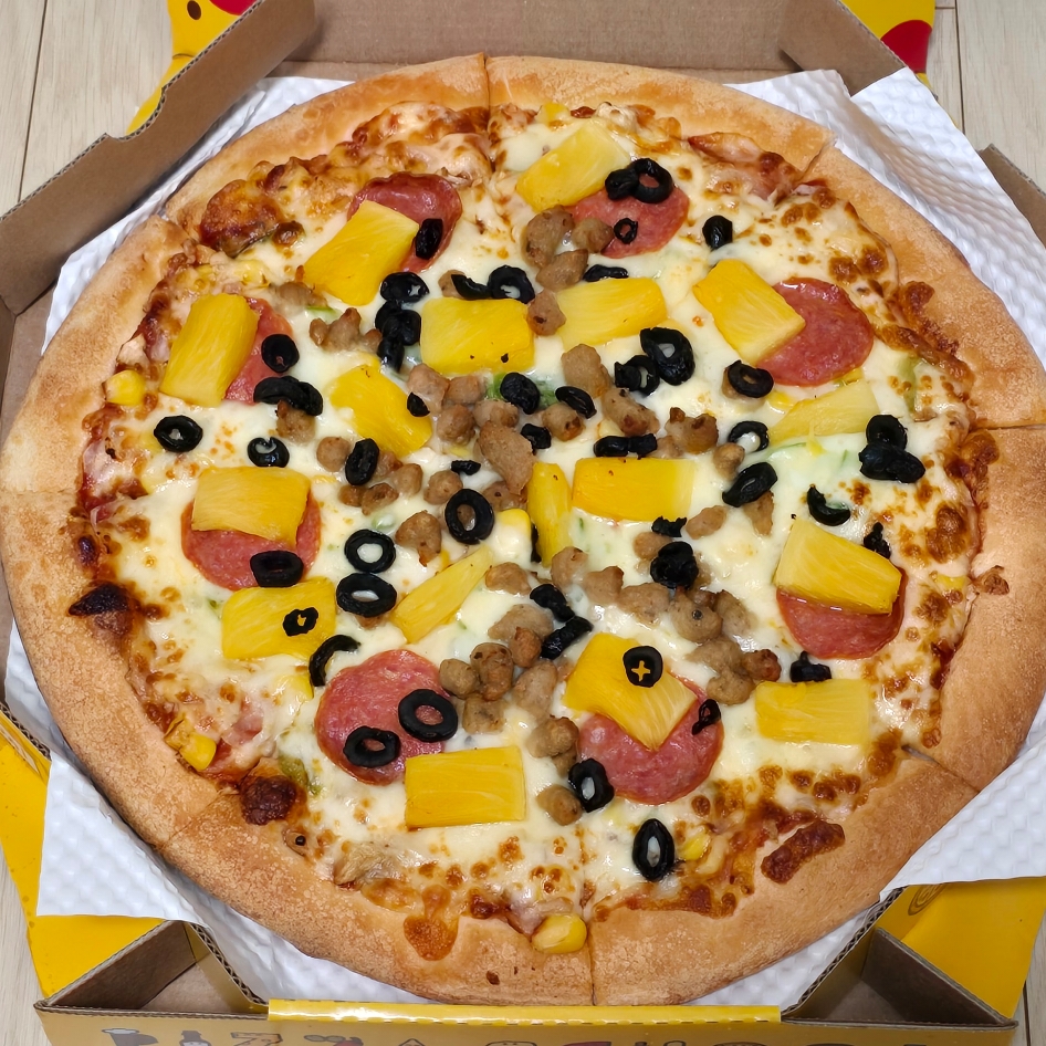 기본 컴비네이션 피자(12900원)에 블랙올리브(1000원)와 파인애플(2000원) 추가. 비쥬얼이나 냄새도 좋았답니다.