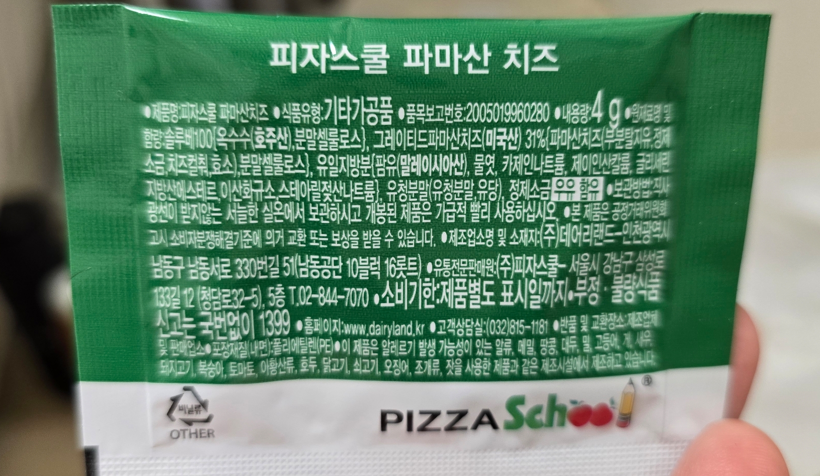 피자스쿨 파마산 치즈 제조원은 (주)데어리랜드.