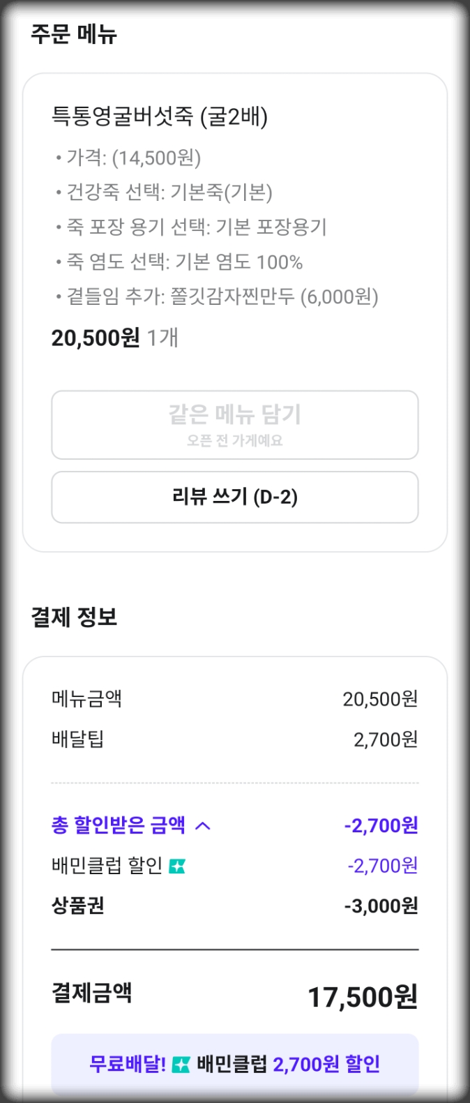 본죽 배달비 할인은 배달의 민족 배민클럽 구독만 가능하더라고요. 쿠팡이츠나 요기요 요기패스는 구독해도 본죽은 배달비 할인이 없어요. 배달비 4500원 너무 아까비~~'