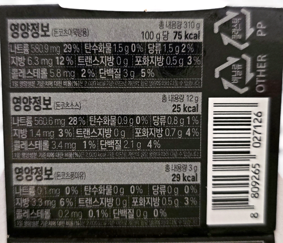 거기에 돈코츠 소스의 나트륨 560.6mg (28%)를 더하면 하루 섭취 권유량의 115%가 됩니다. 참고하세요.