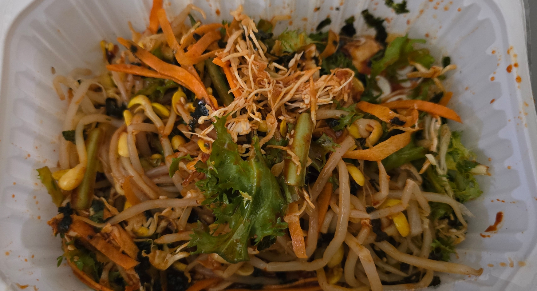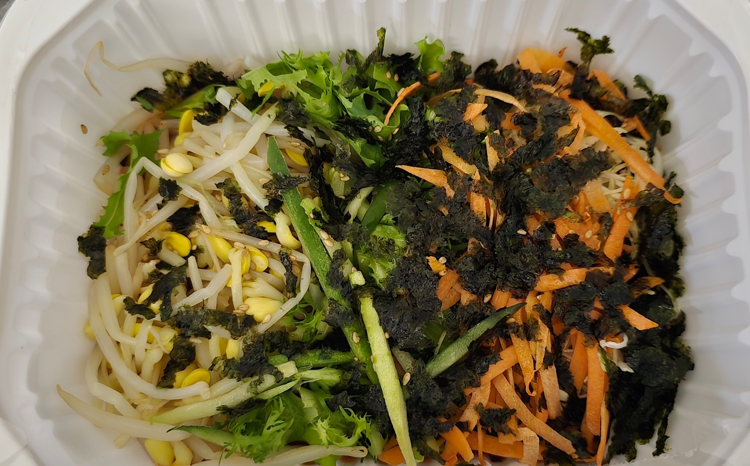 상추조각인지 치커리인지와 당근, 콩나물, 양배추 정도 들었어요.