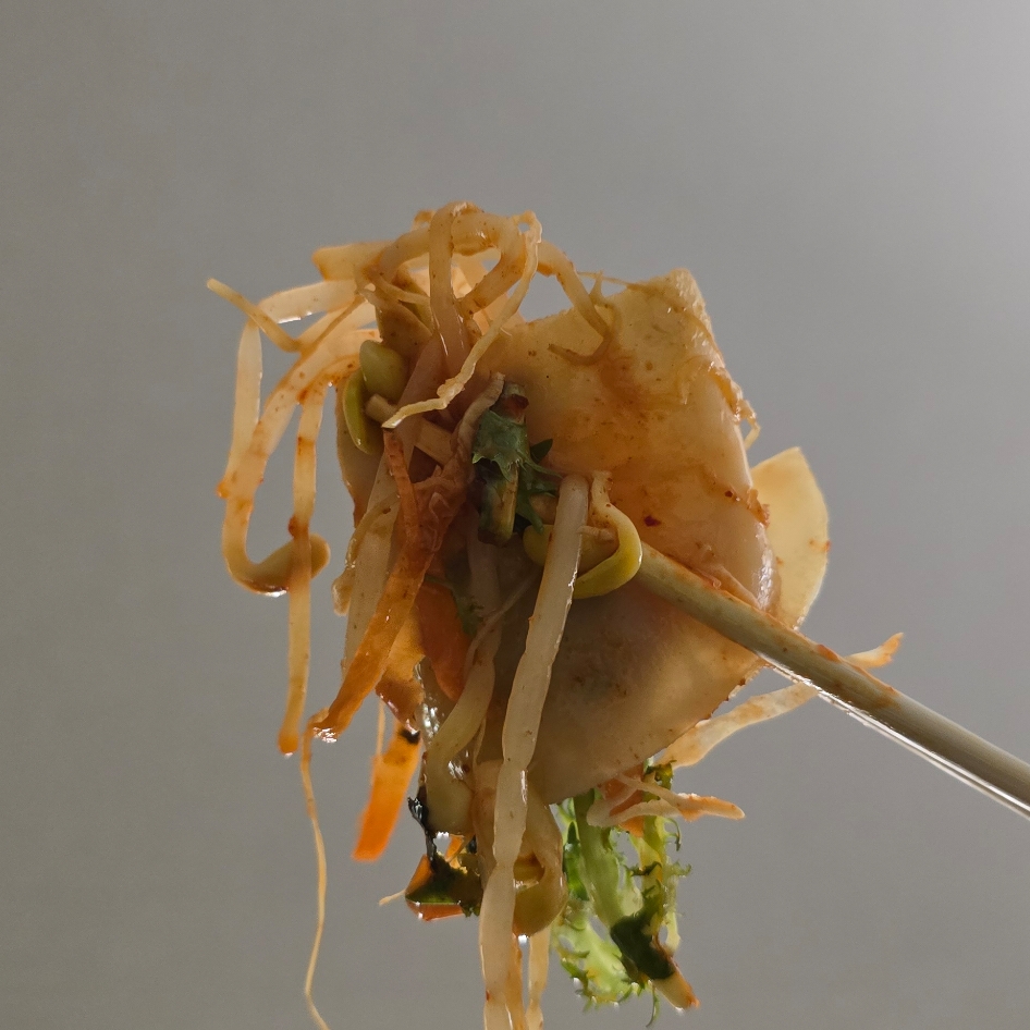 아래엔 초장이 깔려 있어 비비신 후 납작만두랑 같이 드심 아삭하고 담백하고 맛있어요.