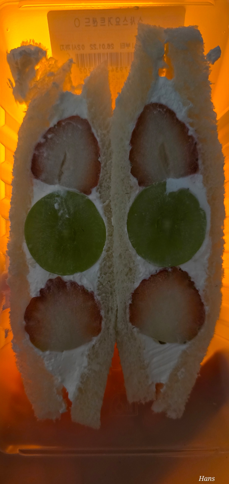 큼직한 딸기와 샤인머스켓이 크림 사이사이 박혀 있는 과일 샌드위치입니다.