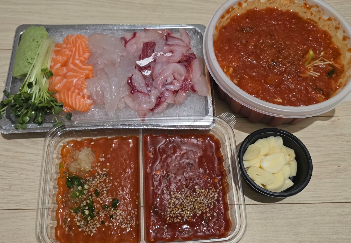 초고추장 이불을 살포시 덮은 마늘님이 쑥스러워하시네요.