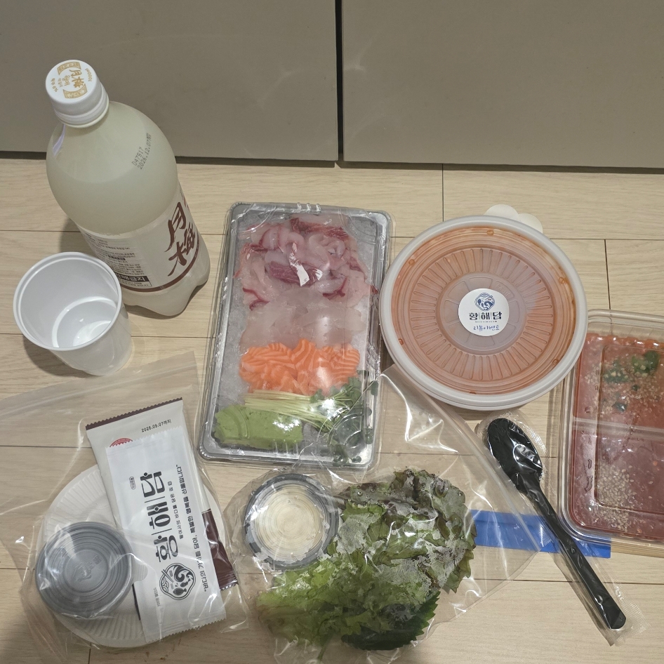 이날도 야심한 밤에 놀러 온 요 두 녀석 때문에 회를 주문하고 보니 집에는 병 따기 애매한 와인과 미니어처 한라산 소주, 위스키가 있는데 저는 막걸리 파.