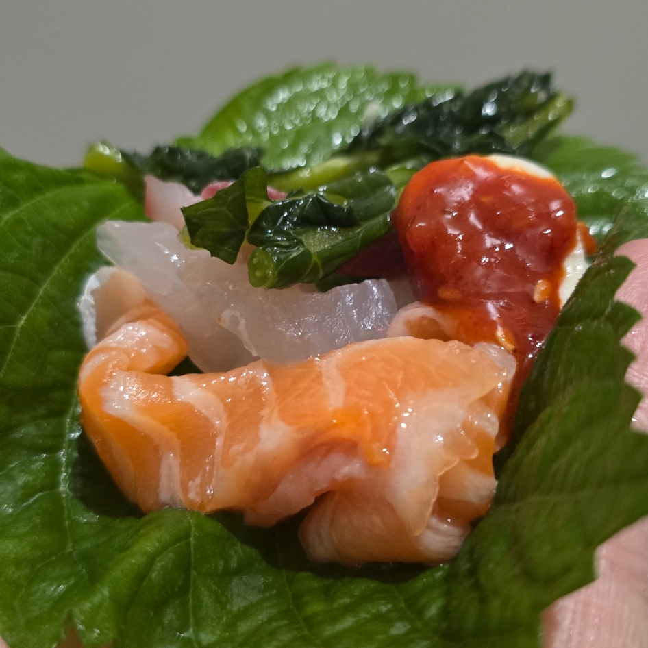 상추에 연어 광어를 얹어 한쌈.