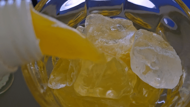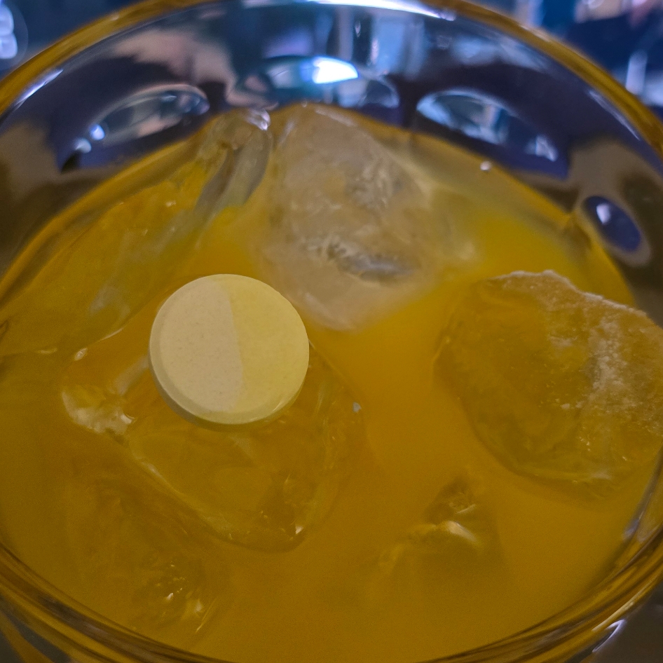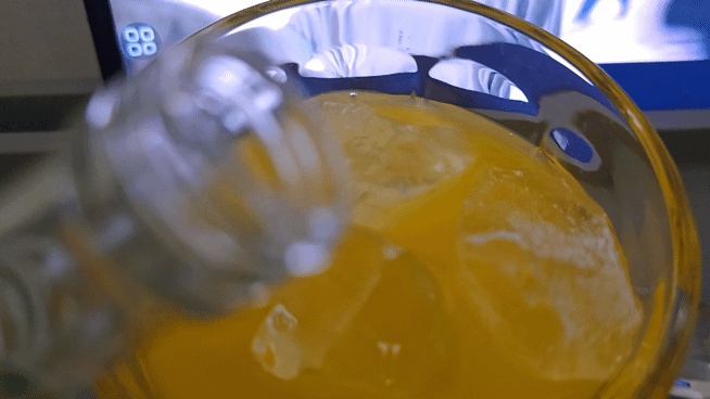하이볼잔에 얼음을 깔고 감귤주스를 투하.