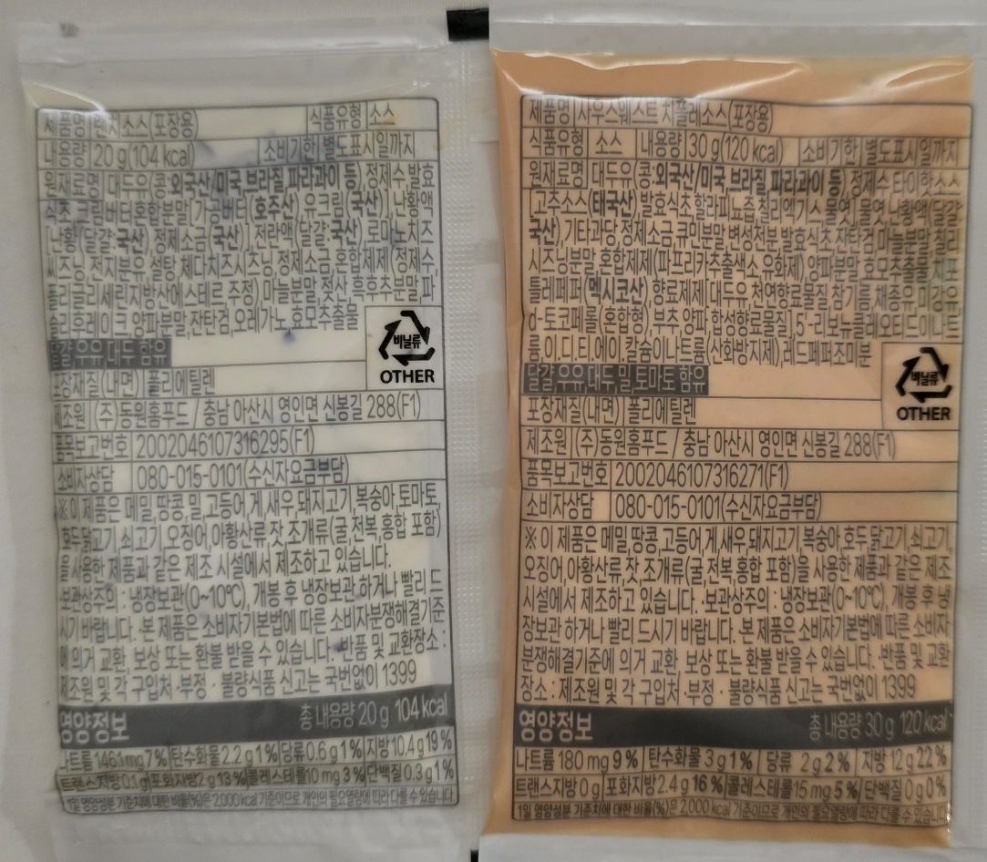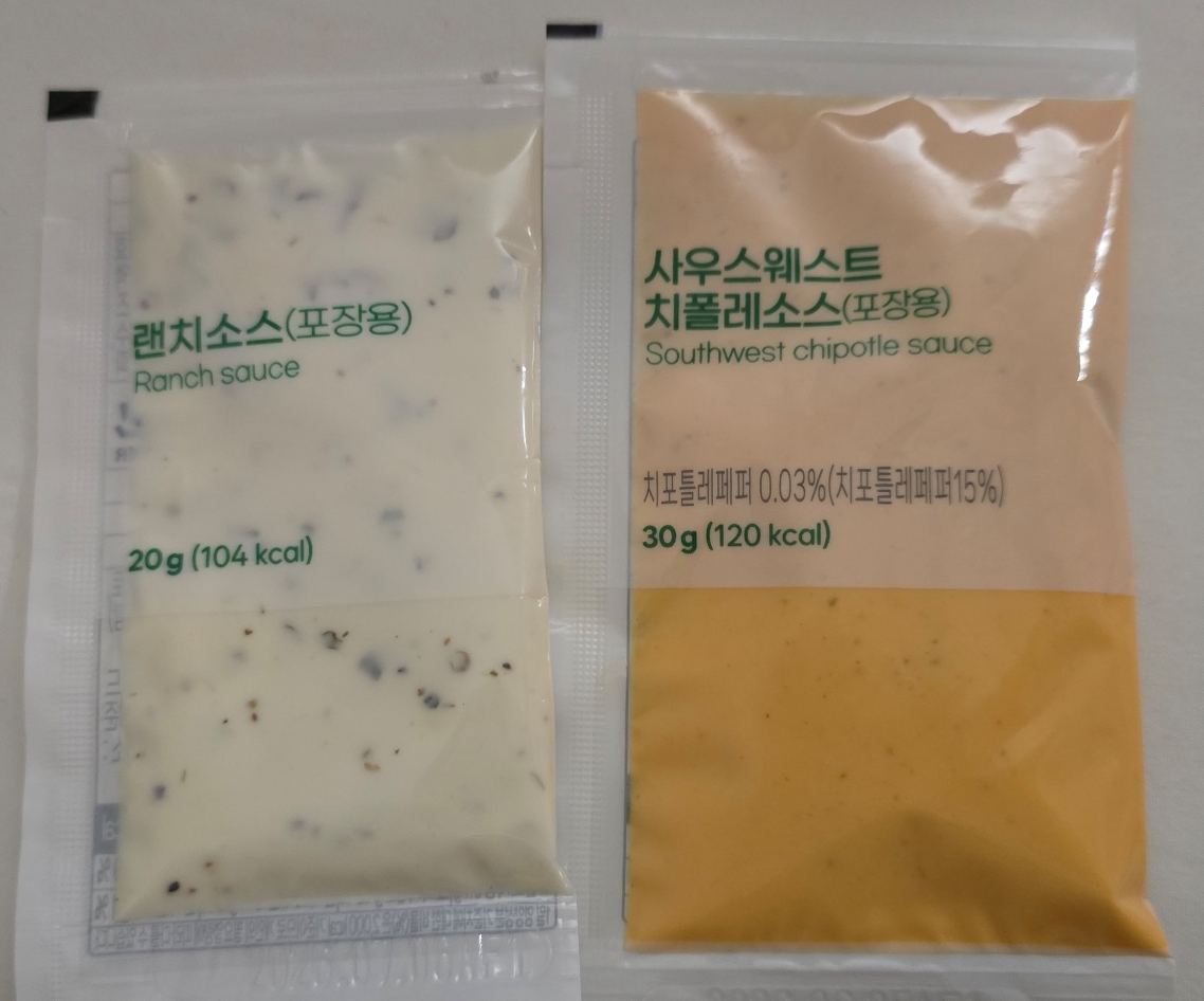 타코 샐러드에 기본으로 하나씩 오는 랜치소스와 사우스웨스트 치폴레소스입니다. 둘 다 맛은 좋네요.