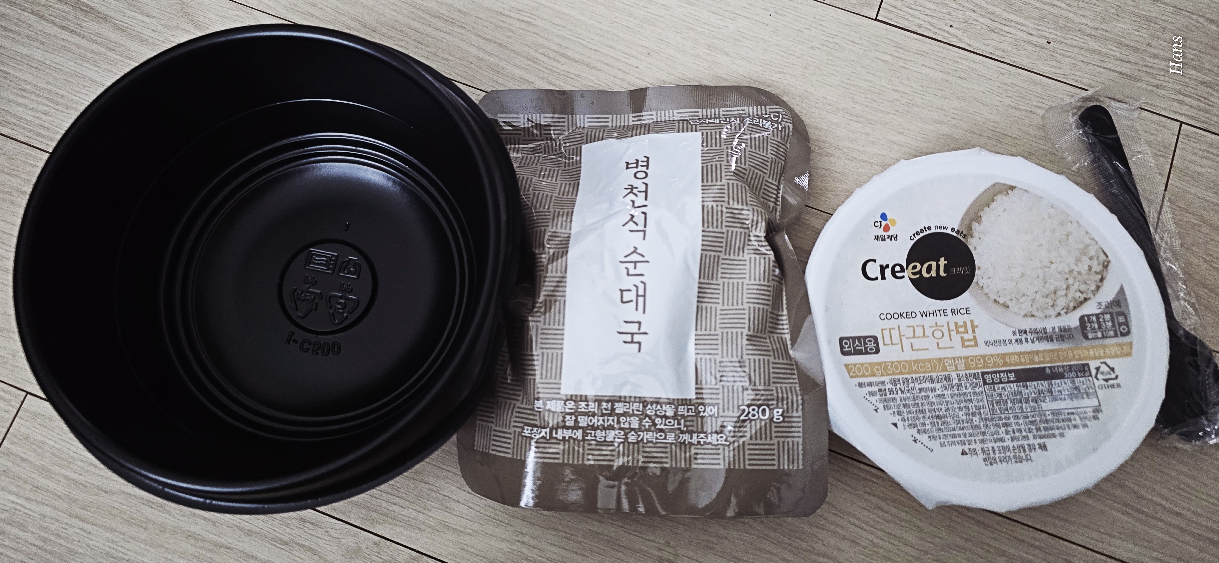 파우치에 들어 있는 순대국과 햇반 그리고 수저 하나가 들어 있는 단순한 구성.